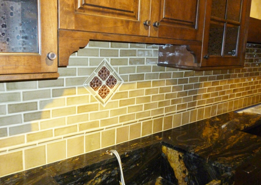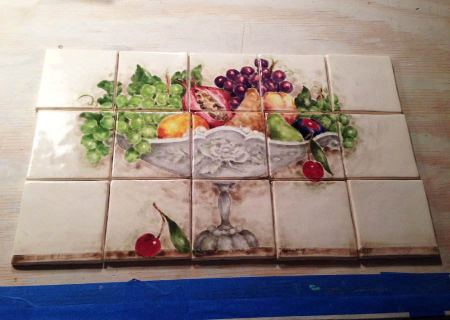 2 X 6 handmade ceramic tile, 5 X 5 handmade ceramic tile, 1 X 6 handmade ceramic liner, hand painted pewter