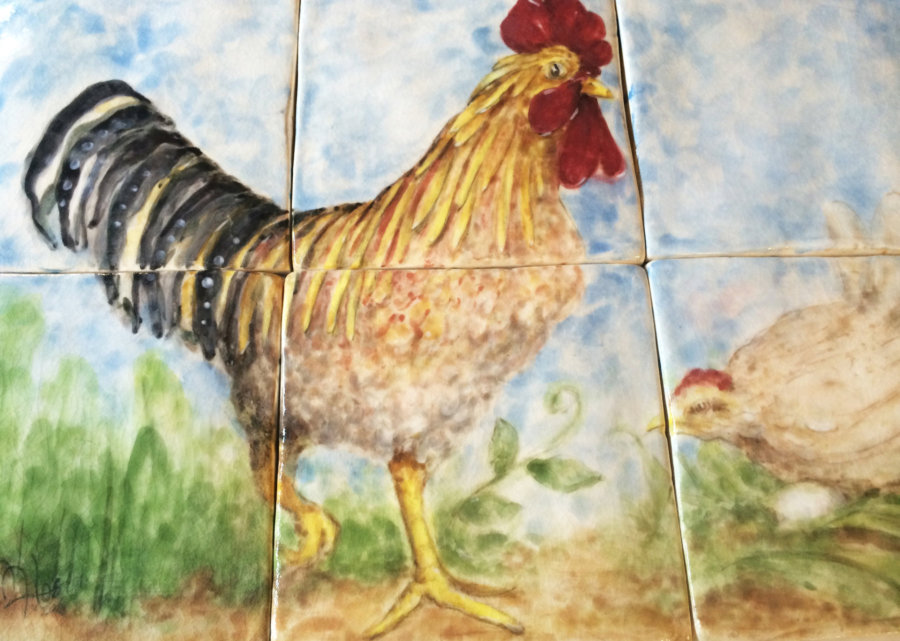 2 X 6 handmade ceramic chair rail Custom, Handpainted Lion and Trees custom hand painted rooster and hen with egg 3 X 6 handmade ceramic tile, color: Danish white.