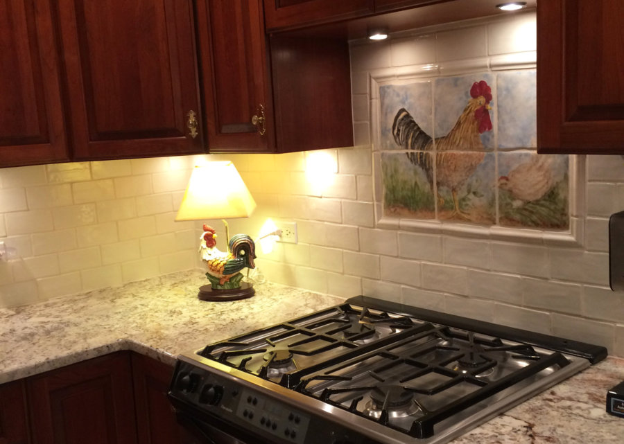 3 X 6 handmade ceramic tile, 2 X 6 handmade ceramic chair rail, custom hand painted rooster and hen with egg, color: Danish white.